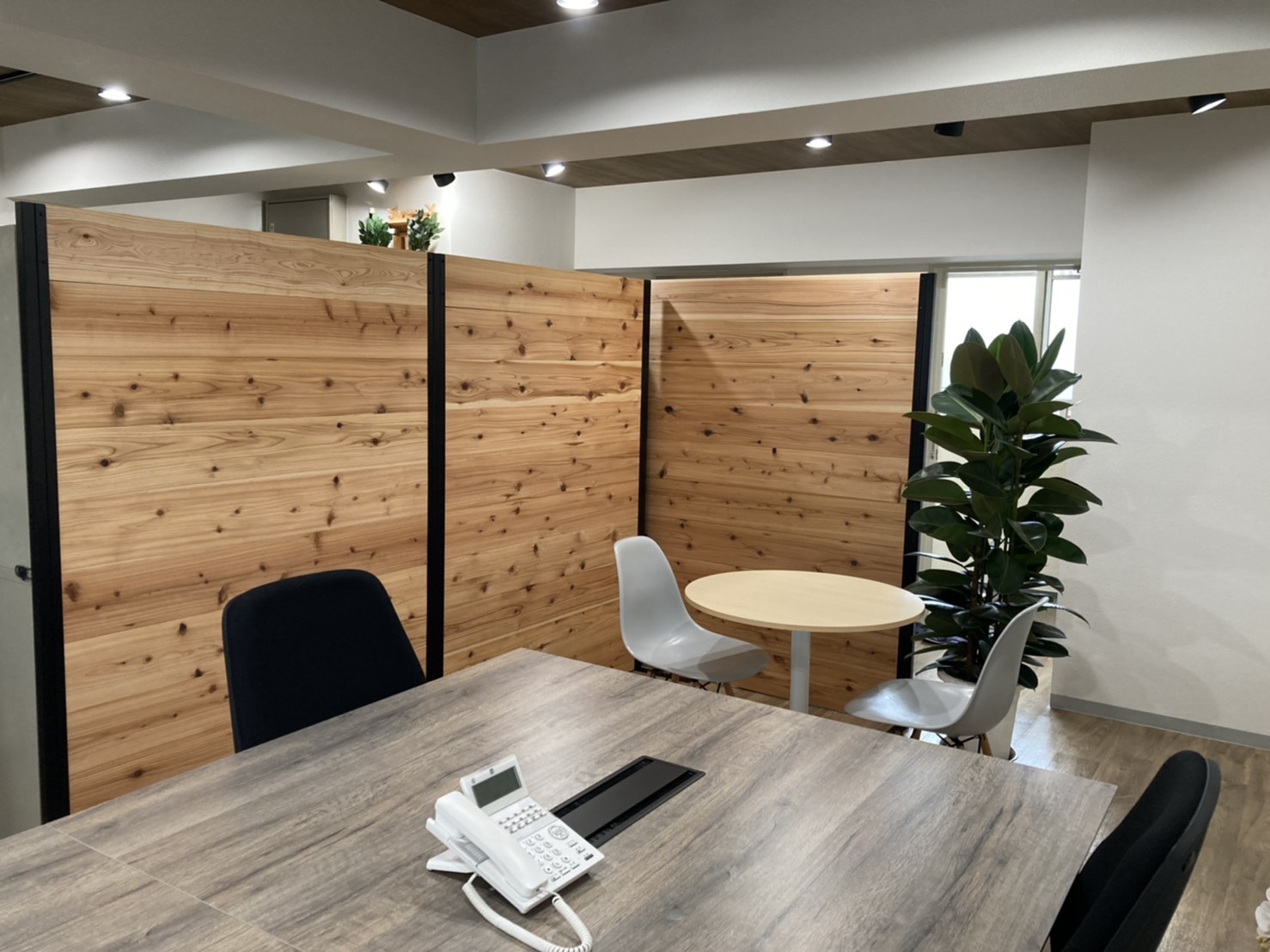 オフィスレイアウトに合わせて、異なる横幅のパーティションをオーダーいただきました。パーティション壁面に設置されたアクリルの社名も良い雰囲気です。